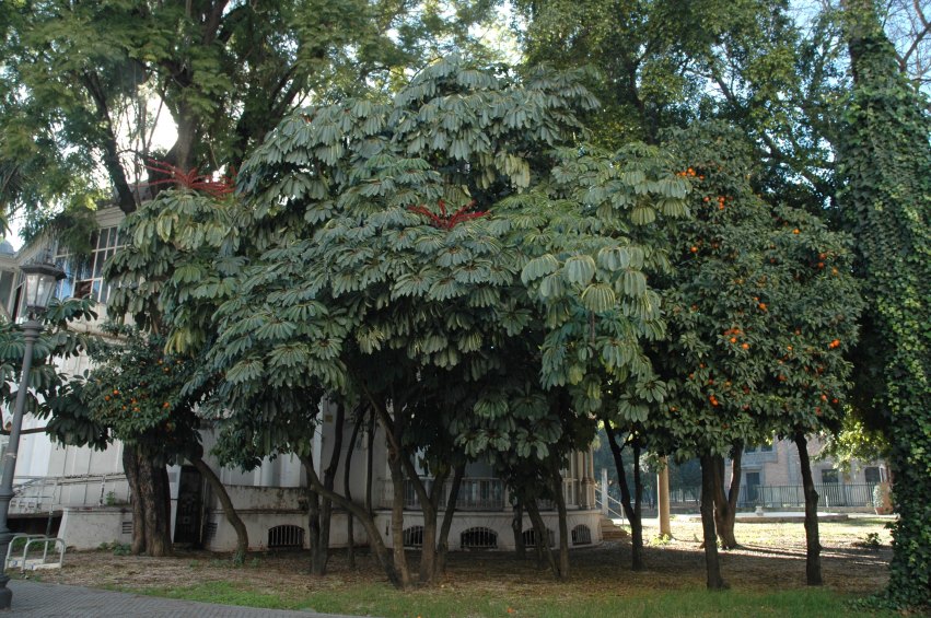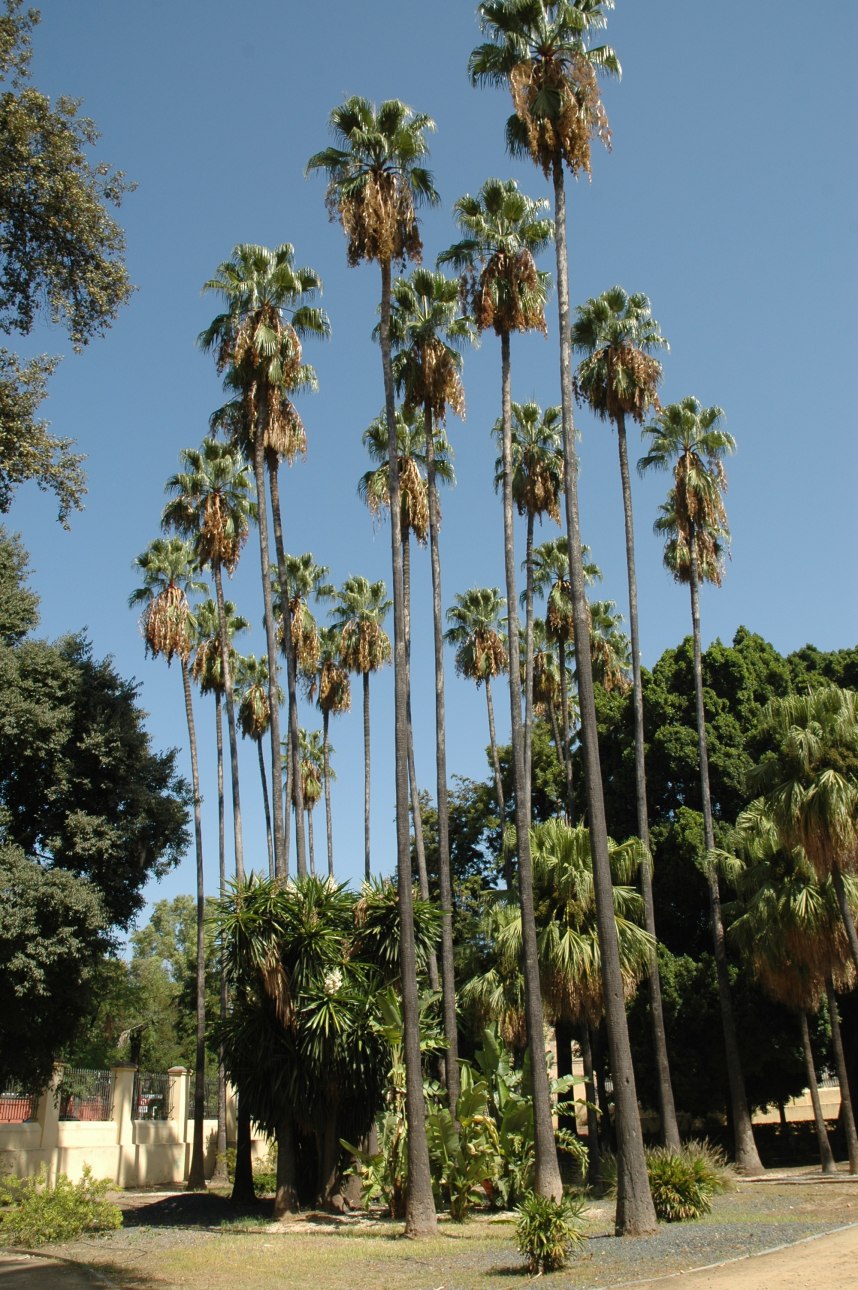 A pesar de su estado de abandono durante años se conservan algunas especies de singular interés, recuerdo una impresionante ombú.- Phytolacca dioica al igual de la que existe en el Palacio que desapareció con la Feria de Muestras ,de las especies que se han salvado y todavía permanecen destacamos bellos ejemplares de Syagrus romanzoffiana.-Coco plumoso los cuales e han incrementado con nuevas plantaciones ,,Magnolia grandiflora y Araucaria frente al Casino ,Platanus x hispanica dentro del Pabellón del Perú, un grupo de Grevillea robusta.-Roble australiano y Lagunaria patersonii ,Arbol pica pica junto a la alberca, el más grande Laurel de Indias de Sevilla.- Ficus microcarpa , grupos de Washingtonia robusta, Livistona chinensis ,magnifico Ficus macrophylla.-Higuera de la Bahia de Moretón,etc… incorporados la Brassaia actinophylla.-Arbol pulpo y Ficus benjamina y la palmera Archontophoenix entre los muchos naranjos que perduran en el jardín etc…, sólo algunos árboles han podido sobrevivir al mal uso que han sido objeto estos jardines.