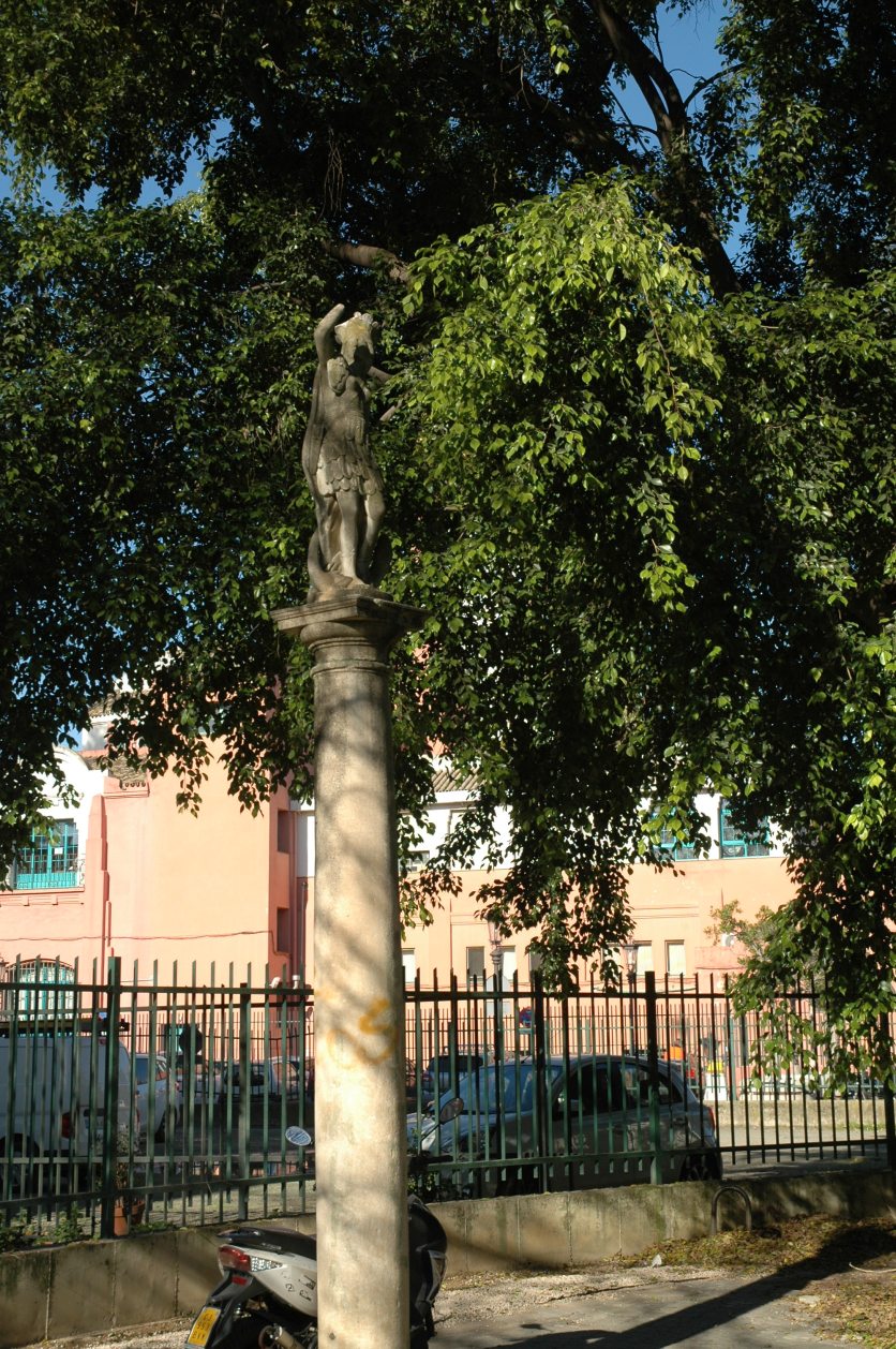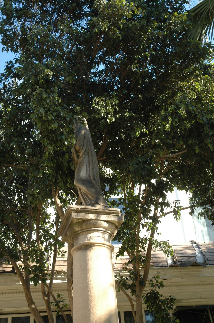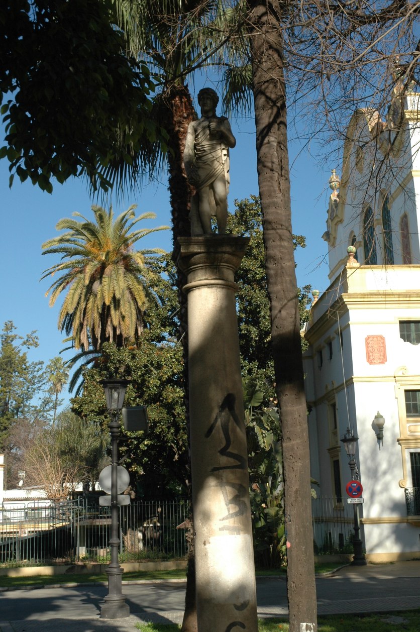 «Al centro del lindero de estos jardines frontero al Parque, se hizo una glorieta con estatuas, comienzo del camino principal que llega a la fachada Sur del Palacio: en la glorieta, después de haber ocupado varios sitios en el tiempo de apogeo de estos jardines, se colocó el pedestal de sillería y estatua de bronce, representando a Fernando VII, vistiendo traje real, con manto y corona de laurel, estatua moderna hecha en París, procedente en 1861 de un palacio que allí tuvo la regente Doña María Cristina, viuda de Fernando VII, padres de la Infanta Doña María Luisa, Duquesa de Montpensier, ahora guardada en el Museo Municipal de la Torre de D. Fadrique»