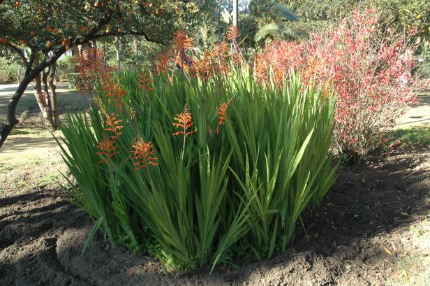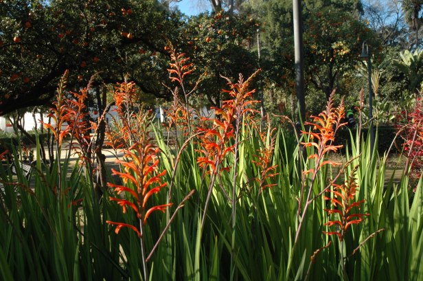 Su floración es en febrero, comúnmente se la conoce como gladiolo de invierno, es una planta alóctona que se encuentra en los jardines de las Delicias actualmente en flor.