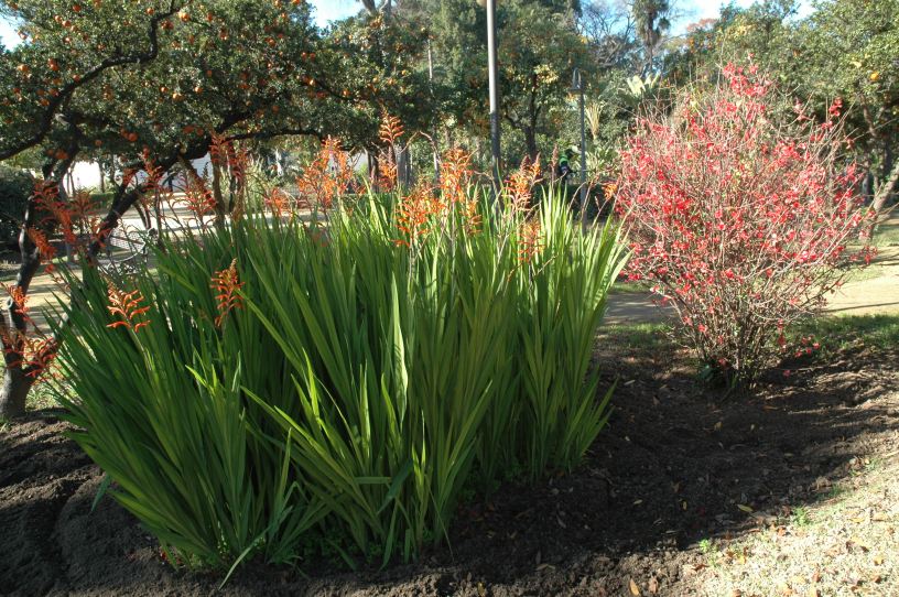 Su floración es en febrero, comúnmente se la conoce como gladiolo de invierno, es una planta alóctona que se encuentra en los jardines de las Delicias actualmente en flor.