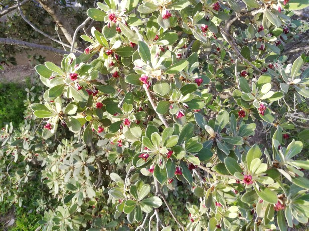 PITOSPORO CORIACEO. Nombre común.-Karo .-Nombre científico.–Pittosporum crassifolium, Banks & Sol. ex A.Cunn Familia Pittosporaceae Originario de Nueva Zelanda.