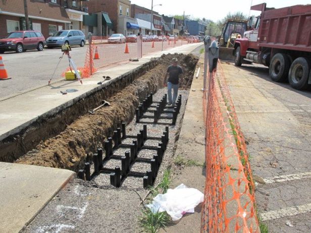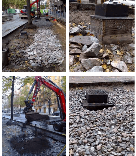 El suelo estructural se ha utilizado junto con las celdas Silva para salvar espacios alrededor de líneas de servicios públicos y obtener un mejor incremento del volumen de enraizamiento alrededor de los bordes y debajo de las celdas Silva en espacios reducidos..