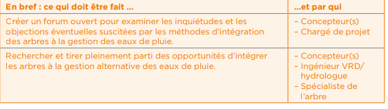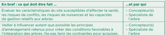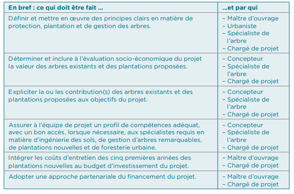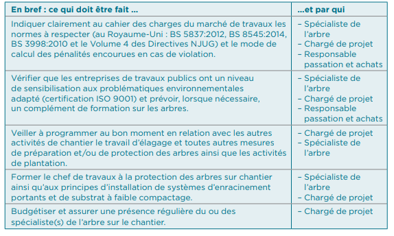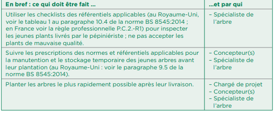 En resumen: qué se debe hacer … … y quién utiliza las listas de verificación de referencia aplicables (en el Reino Unido, consulte la Tabla 1 en el párrafo 10.4 de BS 8545: 2014; en Francia, consulte la regla profesional PC2.- R1) inspeccionar las plántulas entregadas por el vivero; No acepte plantas de mala calidad. – Especialista en árboles Siga los requisitos de las normas y estándares aplicables al manejo y almacenamiento temporal de árboles jóvenes antes de plantar (en el Reino Unido: consulte el párrafo 9.5 de BS 8545: 2014). – Diseñador (es) – Especialista en árboles Plante árboles tan pronto como sea posible después de la entrega. – Jefe de proyecto – Diseñador (s) – Especialista en árboles.