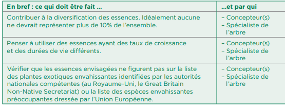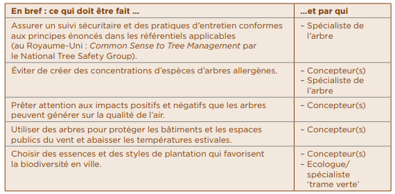 British Standard 8545: 2014 Árboles: de vivero a independencia en el paisaje – Recomendaciones, British Standards Institution, Londres. El Código de conducta para las plantas exóticas invasoras. http://www.codeplantesenvahissants.fr/accueil/ Ministerio de Equipamiento, Transporte y Vivienda. (1999). Contrato de obras públicas – Cláusulas técnicas generales – Fascículo 35 – Paisajismo, deportes al aire libre y áreas recreativas, Boletín Oficial, París. http://www.developpement-durable.gouv.fr/IMG/ pdf / F35_2012-05-30.pdf La base de datos de los árboles adecuados para el cambio climático. http://www.righttrees4cc.org.uk Santamour, F.S. (1990), «Árboles para la plantación urbana: diversidad, uniformidad y sentido común», USDA, Actas de la 7ª Conferencia de la Alianza Metropolitana de Mejoramiento de Árboles, Lisle, Illinois. http://www.ces.ncsu.edu/fletcher/programs/ nursery / metria / metria07 / m79.pdf Sjöman, H. (2012). Árboles resistentes para sitios difíciles: aprender de la naturaleza. Tesis doctoral. Alnarp, Universidad de Alnarp, Suecia. Trowbridge, P.J. y Bassuk, N.L. (2004), Trees in the Urban landscape: Evaluación, diseño e instalación de sitios, Wiley & Sons, Inc., Hoboken, New Jersey.