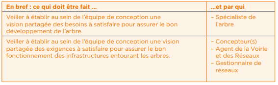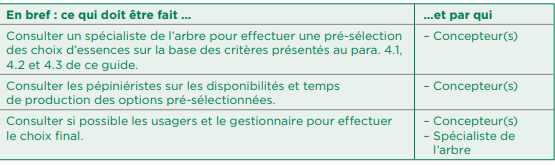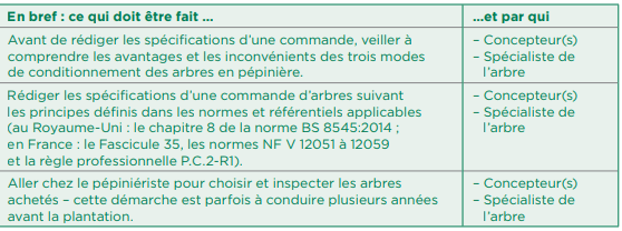 Además de las especies y cultivares deseados, es esencial que el documento de especificación defina las condiciones morfológicas y fisiológicas de los árboles deseados, su modo de acondicionamiento y las garantías de bioseguridad requeridas. Respecto a las condiciones morfológicas, el mínimo a definir reside en cuatro puntos: