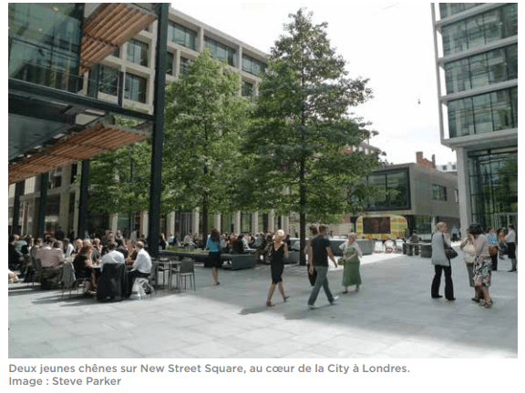 Dos robles jóvenes en New Street Square, en el corazón de la ciudad de Londres. Imagen: Steve Parker