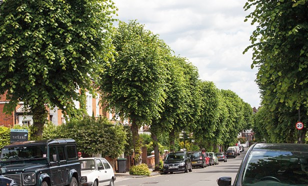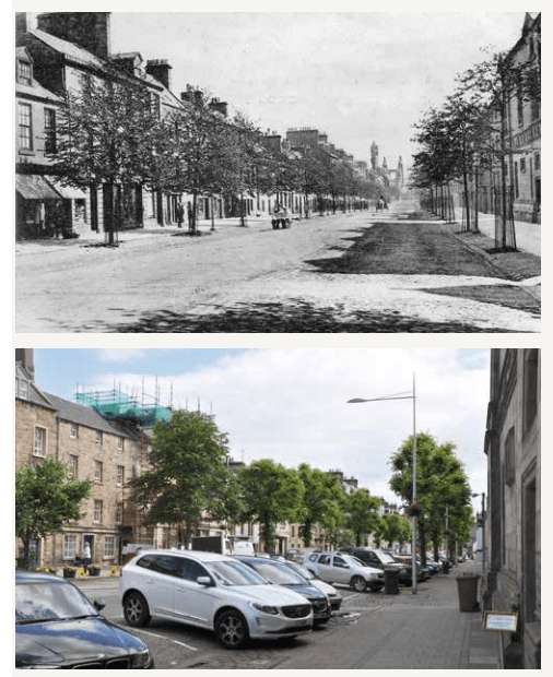 - – Su susceptibilidad a los ataques del áfido del tilo causa la degradación de los flujos de mielada en detrimento de las personas y los objetos que se encuentran debajo. En lugar de renovar de manera idéntica, la comunidad local (Consejo de Fife) ha decidido preferir la cal de Crimea (Tilia euchlora) a su prima de hoja grande porque tiene una forma similar pero es más pequeña en tamaño. Es resistente al áfido del tilo. Postal de South Street en 1896 (arriba) y South Street en 2014 (abajo). Imagen: Stephen Liscoe.
