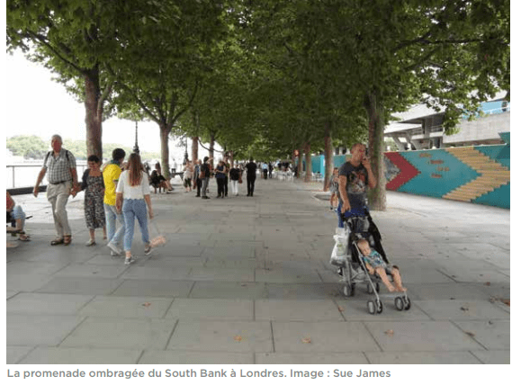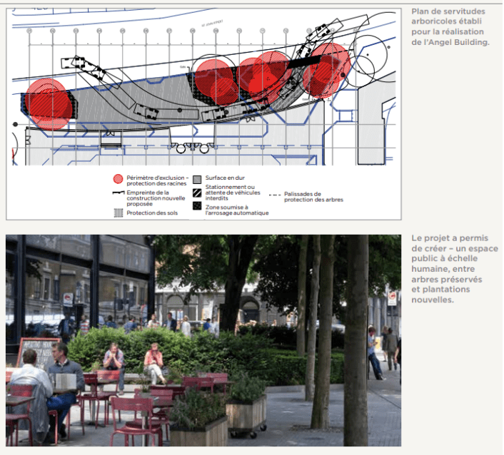En respuesta a estos desarrollos, la autoridad local que administra la City of London (City of London Corporation) ha lanzado una recalificación de espacios públicos para mejorar la comodidad y seguridad de los peatones sin afectar el tráfico de vehículos. El ancho de las calles de rodaje se ha reducido de tres a cuatro metros y las aceras se han ampliado en promedio de tres metros. El mobiliario urbano se ha modernizado y simplificado, y las zonas de entrega en las aceras para garantizar el suministro de tiendas sin comprometer el flujo de tráfico o crear condiciones peligrosas para los ciclistas. El proyecto también permitió renovar un árbol y plantar otros 19 árboles. El posicionamiento de estas plantaciones se ha estudiado detenidamente para garantizar una buena convivencia con las muchas redes subterráneas que prestan servicios en esta área. Es gracias al diálogo con los administradores de estas infraestructuras que se han encontrado soluciones. Varias redes, incluidos los cables de fibra óptica, se han cambiado de 50 cm a un metro para hacer posible la plantación. Sin embargo, la selección de especies ha sido el tema de más debate. El departamento de planificación urbana y el gerente del proyecto urbano estaban interesados en crear una «avenida» con plantaciones regulares, alineadas y monoespecíficas. Sus colegas en Greenspace y Tree Service observaron que los microclimas muy diferentes en ambos lados de Cheapside no se prestaban a una composición de un solo uso. La acera sur está casi siempre a la sombra, mientras que la acera norte está a pleno sol durante todo el día y también recibe el calor y la luz reflejada por las fachadas de vidrio de los edificios que la bordean. El equipo de Greenspace también señaló que si bien Cheapside es una calle histórica en el centro de Londres, ahora está formada por edificios modernos dispares que están más o menos retrasados. Si bien la alineación de un árbol parecía una buena idea para ayudar a «mantener» la calle, la modernidad de las formas urbanas no parecía requerir el uso de un estilo de plantación monolítica del siglo XIX. Este es, en última instancia, el principio de adaptación a las limitaciones climáticas del sitio que prevaleció, con alisos (Alnus x spaaethii) plantados en el lado sombreado y liquidambar (Liquidambar oriantalis) en la acera soleada. Los conteos realizados antes (2006) y después (2013) del trabajo mostraron que se habían alcanzado los objetivos perseguidos: el tráfico peatonal aumentó en un 50%, la presencia de ciclistas en un 200% mientras que el tráfico de automóviles se mantuvo estable. Cheapside a principios de otoño de 2013. Imagen: Ciudad de Londres.