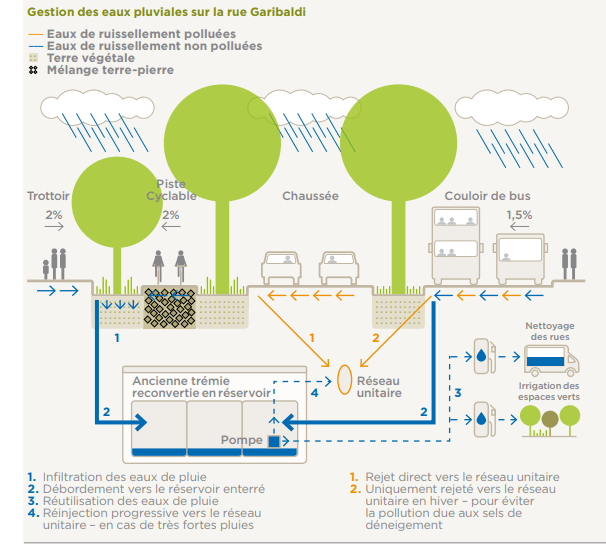 Gestión alternativa de aguas pluviales: un conjunto de prácticas destinadas a ralentizar, reducir o incluso limpiar los flujos de escorrentía mediante dispositivos de superficie que utilizan suelos y plantas, en lugar de favorecer su gestión mediante redes unitarias o separativas.