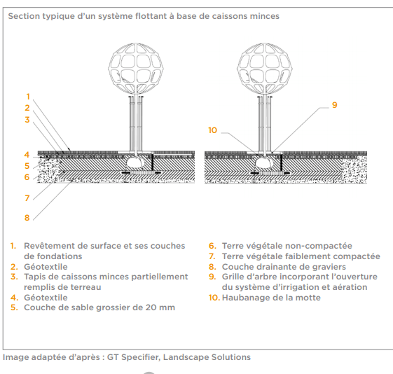 . Sistema flotante: colchón permeable de grosor variable y con una estructura abierta colocada entre el espacio de enraizamiento por una parte y el recubrimiento de la superficie y sus posibles capas de cimientos por otra parte, para difundir las cargas y reducir la carga.