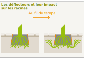Deflector de raíz: Una barrera impermeable colocada alrededor del cepellón de raíz para evitar el crecimiento de la raíz en la superficie del suelo y dirigirla hacia abajo.