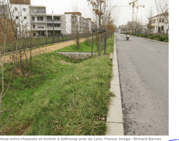 Noue: depresión alargada y con vegetación utilizada para el transporte, la infiltración, el almacenamiento y / o la bioretención de la escorrentía.
