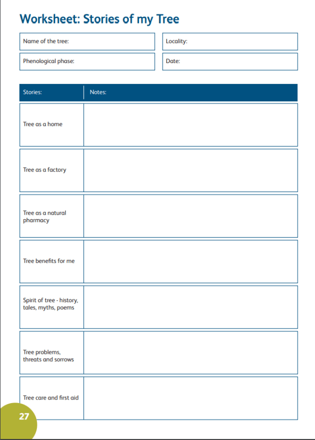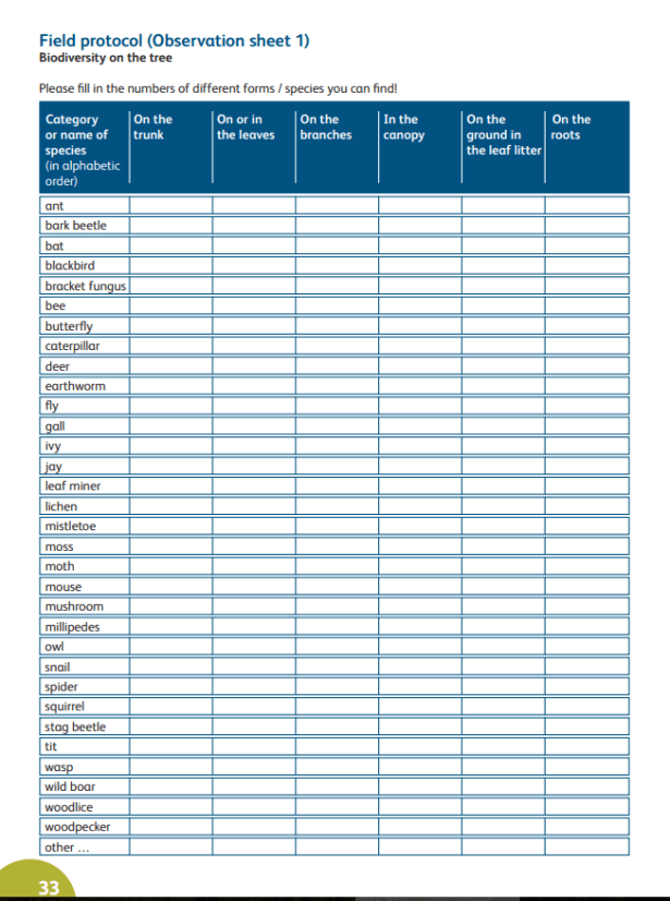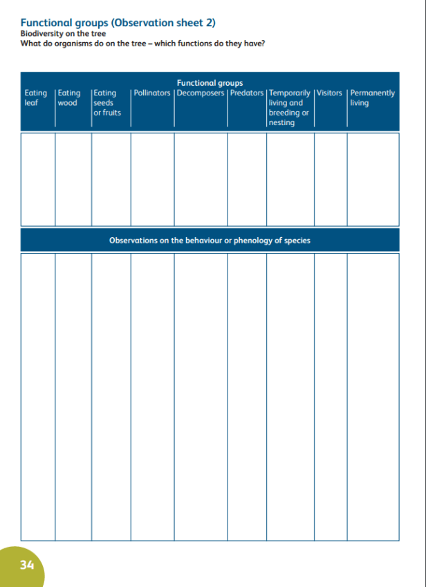 Hoja de observación 2: ¿Qué hacen los organismos en el árbol? ¿Qué funciones tienen ?: Puede leer en la descripción cómo los organismos usan el árbol (para comer, anidar, simplemente para relajarse o para refugiarse …) y qué roles tienen. En la vida de la “comunidad del árbol”. Estos son los llamados grupos funcionales (por ejemplo, comer hojas, polinizadores, depredadores, descomponedores, visitantes, etc.). Complete cada línea con la cantidad de organismos diferentes que ha encontrado y haga comentarios sobre cómo se comportan. También puede encontrar la misma hoja de trabajo en el sitio web, donde puede cargar y compartir sus datos.