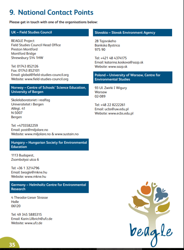 La educación juega un papel clave para desarrollar esta colaboración y cambio en la sociedad. Pero este proceso de cambio en la sociedad depende mucho de la calidad de la educación y necesita apoyo para los docentes. El objetivo general del proyecto BEAGLE es mejorar la calidad del aprendizaje fuera del aula y aumentar la motivación de los estudiantes para aprender de modo que se fortalezca la capacidad de las personas para vivir estilos de vida sostenibles y lograr un entorno más sostenible. Y ahora … La siguiente sección le brinda una breve descripción general de todo el proyecto paso a paso. Las secciones restantes le proporcionan ideas, información detallada y actividades para completar el proyecto en las escuelas.