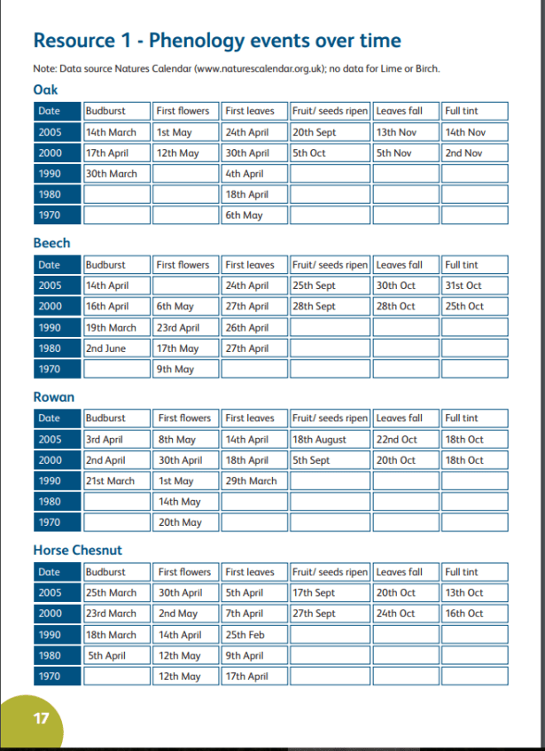 Los árboles son indicadores útiles de un entorno cambiante, cambios que están influenciados por nosotros. Al explorar la Fenología de los árboles durante un período más prolongado, podemos averiguar si el calendario de los eventos está cambiando y por qué podría ser así. Las siguientes actividades te ayudarán a hacer esto.