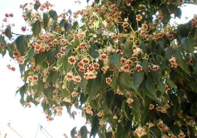 Es un gran árbol de hoja perenne con las ramas frágiles que alcanza los 20 metros de altura. Las hojas son alternas, pecioladas, de forma ovalada, coriáceas y acuminadas de color verde brillante y con tres nervios principales que presentan en sus axilas unas pequeñas glandulitas. Las flores son blancas amarillentas y aparecen en mayo-junio agrupadas en panículas corimbosas dispuestas en sus axilas. El fruto es una baya en forma de globo de color rojizo que torna a negro cuando madura.