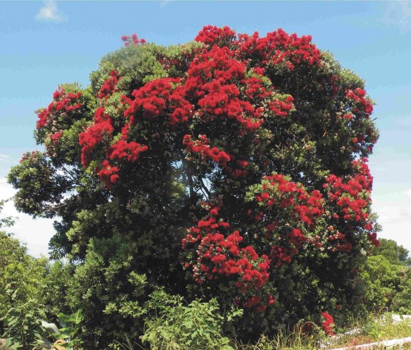 El Metrosideros es un árbol perennifolio de la familia de los mirtos que produce una conjunto de flores brillosas compuesta de conjuntos de estambres, es una de doce especies de Metrosideros endémicas de Nueva Zelanda.