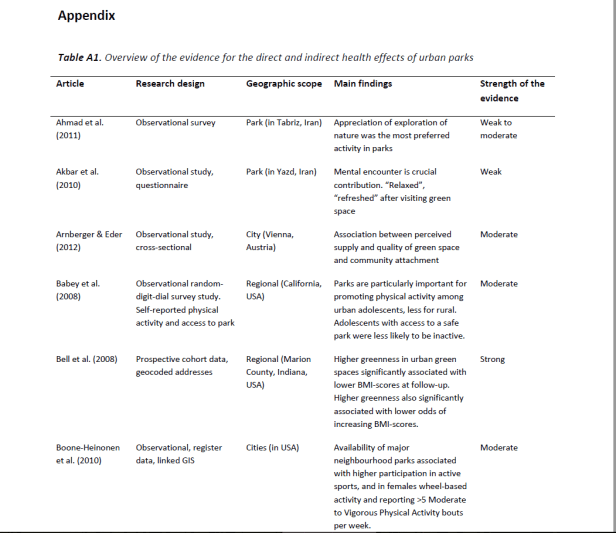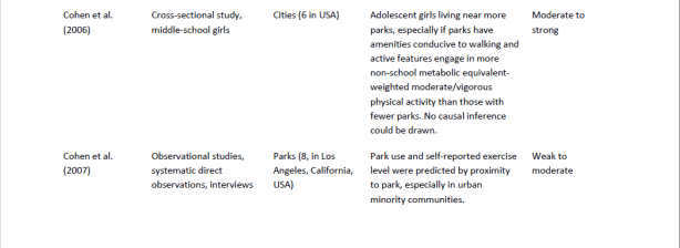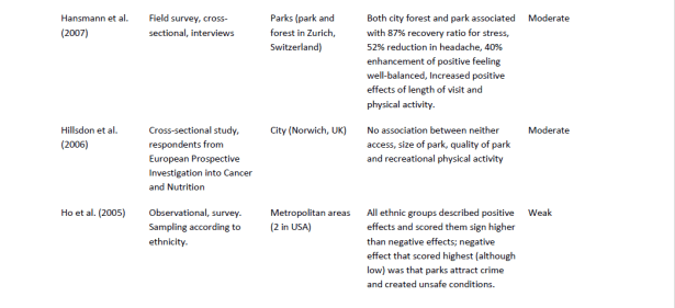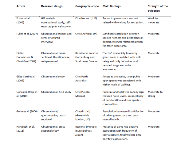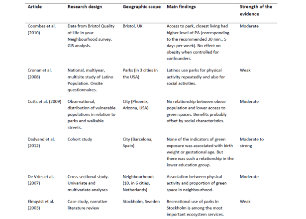La solidez de las pruebas de los documentos respectivos se evaluó basándose, por ejemplo, en el tipo de papel (por ejemplo, el metanálisis y las revisiones sistemáticas que representan la prueba más sólida), la rigidez del enfoque científico y la calidad del conjunto de datos, por ejemplo, en términos de número de encuestados y aleatorización (como se describe en los criterios de evaluación de calidad presentados en el capítulo método de este informe). Cinco de los estudios fueron evaluados como débiles en términos de fuerza de la evidencia proporciona, mientras que sólo dos (Deng et al., 2010; Majumdar et al., 2011; ambos estudios que abordan los espacios verdes en Savannah, Georgia) fueron considerados como una prueba moderada. En general, el tema de cómo los parques urbanos impactan el turismo no se ha prestado mucha atención en la literatura científica, al menos no desde el año 2000.