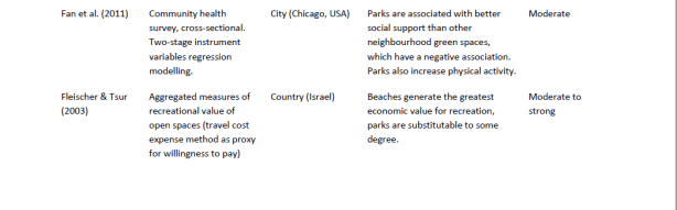 En conclusión, hay algunos indicios de que los parques tienen beneficios turísticos, pero la fuerza de la evidencia es débil, debido al muy pequeño número de estudios, así como la calidad de los estudios encontrados. El estudio en Hong Kong, por ejemplo, tenía una muestra muy pequeña y no representativa de los turistas. El impacto económico de los parques en el turismo sólo se abordó en la obra de Majumdar et al. (2011) Savannah, Georgia. Aunque la evidencia proporcionada por este estudio supera a la de los otros estudios, el problema es que los hallazgos no estaban específicamente relacionados con los parques urbanos, sino más bien con todo el «bosque urbano» de la ciudad. Este tipo de estudios de valoración contingente también depende en gran medida del contexto local (económico).