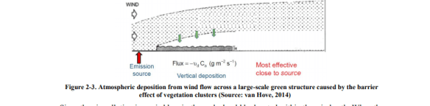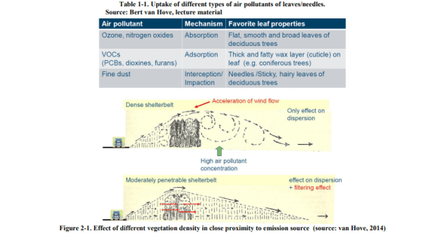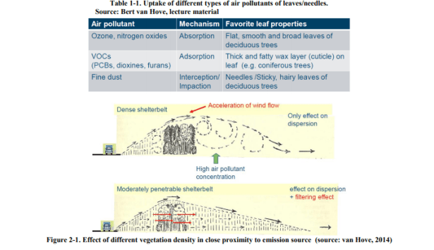 El tráfico y la construcción, junto con la industria, la calefacción doméstica y los desechos urbanos (drenaje de aguas residuales abiertas, vertederos o incineradores de desechos sólidos) crean un problema para la calidad ambiental a través del exceso de humo. No solo crea malestar, sino que a la larga la contaminación del aire producida por las actividades urbanas aumenta las enfermedades respiratorias y cardiovasculares. La vegetación, como la que se encuentra en los parques, puede mejorar la calidad del aire al eliminar los contaminantes de la atmósfera, incluido el ozono (O3), el dióxido de azufre (SO2), el dióxido de nitrógeno (NO2), el monóxido de carbono (CO) y las partículas de menos de 10 µm ( PM10) (Escobedo, et al., 2011; Gómez-Baggethun, et al., 2013). La eliminación de la contaminación se produce cuando los árboles y los arbustos filtran las partículas en el aire a través de sus hojas (Nowak 1996, como se menciona en Gómez-Baggethun, et al., 2013).