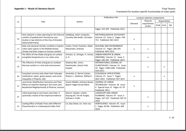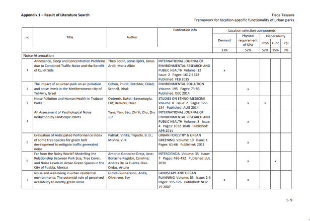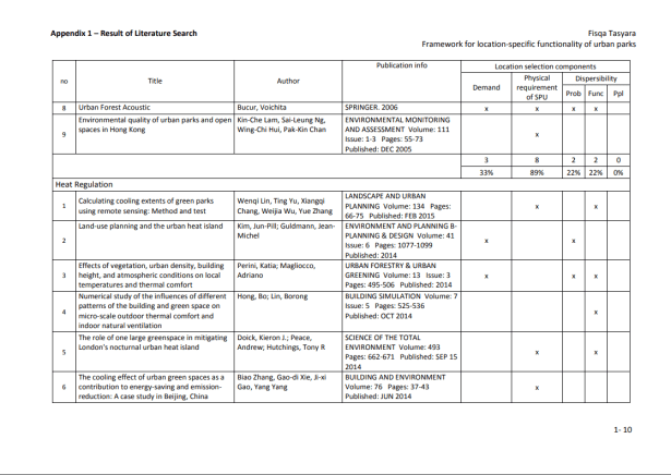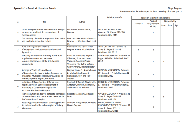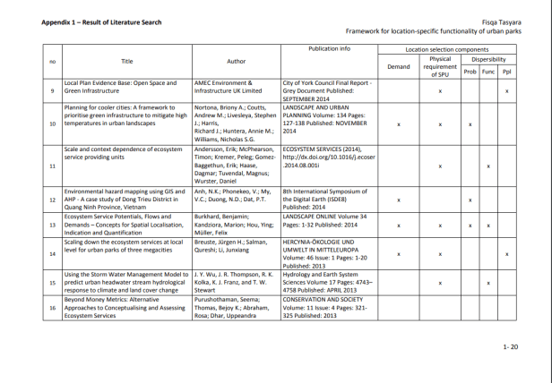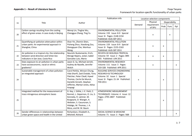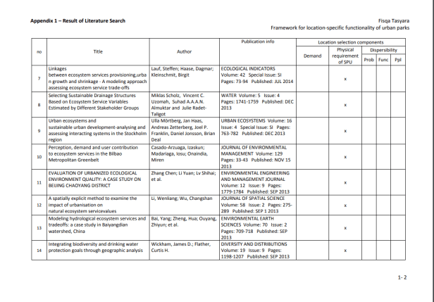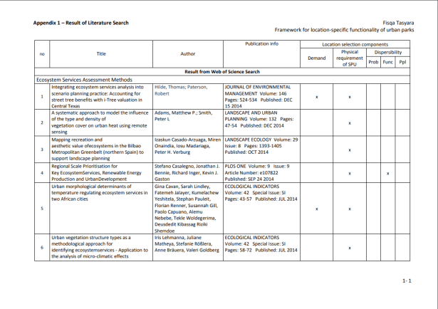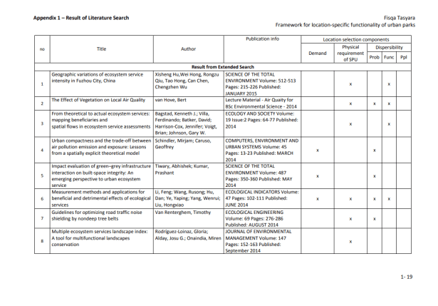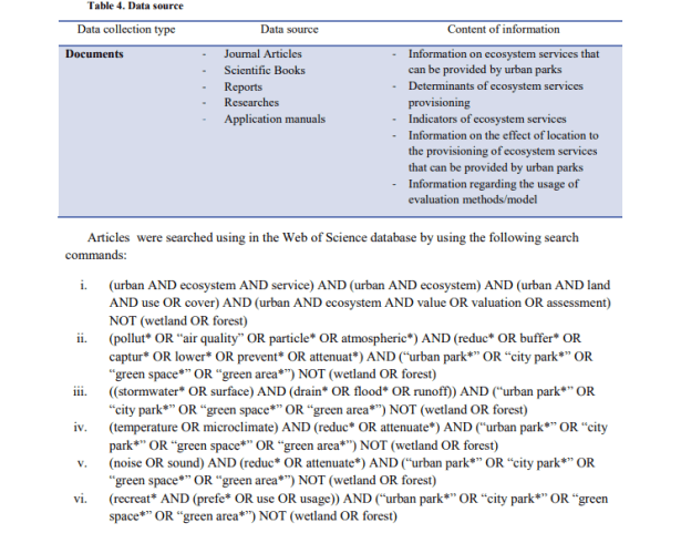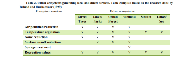 La provisión de servicios y la delimitación de las SPU se producen en múltiples niveles y probablemente dependen tanto del conocimiento común de la población (por ejemplo, el reconocimiento mutuo como servicio y el alcance geográfico de su operación), como de los estándares científicos (Luck et al., 2003). ). Según Kontogiannia, et al. (2010), las SPU pueden delinearse solo después de la identificación de la necesidad humana de un proceso del ecosistema (es decir, una vez que sepamos quiénes son los beneficiarios del servicio), la tasa de prestación del servicio para satisfacer las necesidades de los beneficiarios y las unidades del ecosistema ( y sus características) para proporcionar el servicio (los proveedores de servicios). Es esencial que se establezcan vínculos cuantitativos entre las características de las unidades del ecosistema y la prestación de servicios para definir la unidad y permitir una valoración adecuada. Una vez que se definen las SPU, generalmente simplifica las cosas y, en el caso de los servicios de los ecosistemas, puede establecer el vínculo entre las funciones naturales oscuras de los ecosistemas y los beneficios resultantes. (Ibídem). En las zonas urbanas, los servicios de los ecosistemas son más comúnmente proporcionados por los humedales, arroyos, lagos / mar (para ciudades costeras) y espacios verdes remanentes. Los espacios verdes urbanos son lugares al aire libre con cantidades significativas de vegetación que existen principalmente como áreas artificiales (Uy y Nakagoshi, 2008). Los espacios verdes urbanos pueden tomar forma como espacios abiertos o partes de estructuras de edificios (por ejemplo, paredes verdes). Los espacios verdes abiertos urbanos pueden tomar la forma de bosques urbanos, riberas, parques, jardines y árboles en las calles, que son de propiedad privada o del gobierno para uso público gratuito. La Tabla 3 proporciona la lista de servicios basada en la clasificación de Bolund y Hunhammar (1999) que pueden ser proporcionados por diversos ecosistemas en áreas urbanas. Los parques pueden proporcionar cinco de los seis servicios destacados del ecosistema. Por eso, esta investigación se limitará a esos cinco.