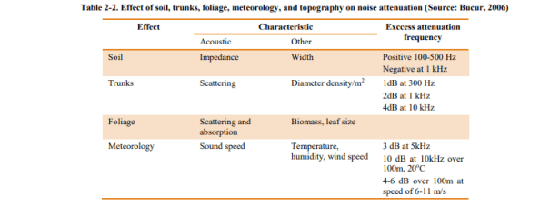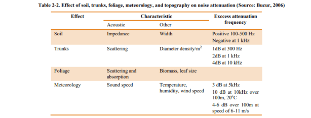 La superficie del suelo y la vegetación en los parques pueden atenuar la contaminación acústica a través de la absorción, la reflexión de desviación y la refracción de las ondas de sonido (Aylor 1972; Kragh, 1981; Fang y Ling, 2003; en Gómez-Baggethun, et al., 2013). Las ondas de sonido son reflejadas y refractadas por los materiales que cubren el suelo, también los troncos y ramas de árboles y arbustos, dispersando la energía del sonido a través de área, o por la amortiguación interna de las oscilaciones de ramas o tallos impulsadas por el sonido (Bucur, 2006; Van Renterghem, 2014).