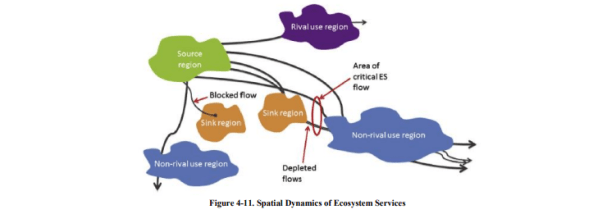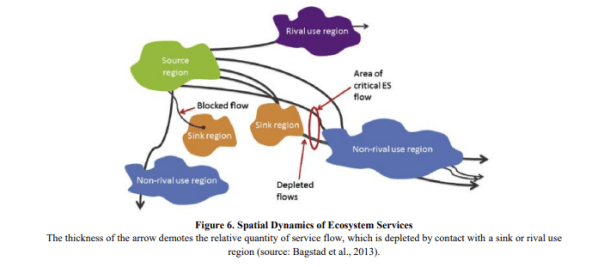 Paetzold et al (2010) explicaron que la provisión de servicios ecosistémicos, la demanda humana y el nivel de provisión deseado de servicios por parte de la sociedad influyen en el estado de un servicio ecosistémico. Según Tallis, et al. (2013), existen tres puntos de medición para evaluar los servicios de los ecosistemas: suministro, servicio y los beneficiarios. La métrica de la oferta solo se ocupa del sistema biofísico o del ecosistema que produce las funciones del ecosistema, la métrica del servicio incluye información crítica que vincula la oferta a los beneficiarios, y la métrica del beneficio pesa el nivel de servicio según las preferencias de la gente o los objetivos de la política social (Tallis, et al. al., 2013). Bagstad, et al. (2013) propusieron evaluar el valor de los servicios ecosistémicos mediante el análisis de la dinámica espacial de los servicios ecosistémicos. Este concepto se desarrolló porque los servicios de los ecosistemas son proporcionados por unidades de ecosistemas solo cuando están en contacto con las personas y son beneficiosas para ellas (por ejemplo, vista panorámica, agua potable, aire puro). Este concepto de dinámica espacial en los servicios ecosistémicos es similar al concepto de flujo de servicios ecosistémicos (Fisher et al., 2009; Syrbe & Walz, 2012; y Serna-Chaveza, et al., 2014). El concepto de flujo de servicios del ecosistema aborda no solo la provisión de servicios, sino también la dispersión del servicio y la importancia del movimiento del transportista y las ubicaciones de las SPU para sus usuarios. Estos conceptos de flujo de servicios no solo se centran en el punto final del servicio, sino también en cómo y dónde los prestan los usuarios / beneficiarios reales o los sumideros (absorbidos, degradados o agotados) de sus proveedores.