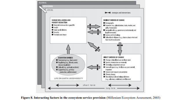 La contribución de los ecosistemas a la economía mundial y al bienestar humano (como se explica en 2.1.4 y se ilustra en la figura 5) ha sido ampliamente reconocida en la ciencia y la política (Rodrigues-Loinaz, et al., 2015). Sin embargo, los servicios de los ecosistemas son cada vez más escasos (Liu, et al., 2010). Esta tendencia se debe a la falta de valoración porque a veces los servicios de los ecosistemas son intangibles (por ejemplo, el servicio de reducción de ruido y recreación). Otros argumentan que valorar el ecosistema es casi imposible, ya que los servicios de los ecosistemas son, en la mayoría de los casos, mejoras en la condición o ubicación del producto (Brown et al., 2007) y que no podemos valorar los «intangibles» como la vida humana, el medio ambiente. Estética o beneficios ecológicos a largo plazo (Constanza, et al., 1997).