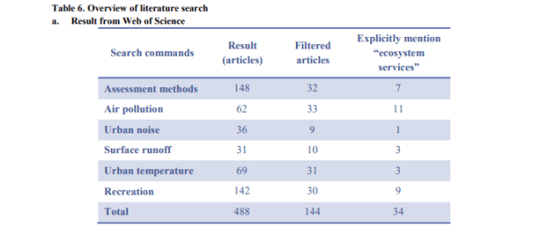 Los investigadores encontraron que en las zonas urbanas, los espacios verdes abiertos pueden mejorar el microclima, absorber los contaminantes del aire, reducir los niveles de ruido y contribuir a ambientes sostenibles (Honjo y Takakura, 1986; Givoni, 1991; Avissar, 1996; Jacobs, 1996; Huang y Chen, 2002; Yang, 2003; Chiesura, 2004; Lam, Ng, Hui y Chan, 2005; Neema y Ohgai, 2010; Cohen et al., 2014). Estos beneficios también se conocen como servicios del ecosistema. Los servicios de los ecosistemas son los beneficios que las personas obtienen del ecosistema, ya sean tangibles (como alimentos y agua dulce) o intangibles (como el mantenimiento de la calidad del aire y la regulación del agua) (Millennium Ecosystem Assessment, 2003), directa o indirectamente de las funciones de los ecosistemas (Constanza et al. al., 1997).