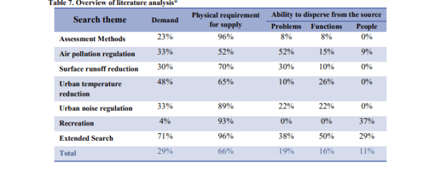 Actualmente, la mayoría de los académicos usan esta clasificación, pero el discurso sobre la necesidad de una nueva clasificación aún está emergiendo (Wallace, 2007; Constanza, 2008, Fisher & Turner, 2008). Para áreas urbanas, Bolund y Hunhammar (1999) identificaron seis servicios ecosistémicos que tienen gran importancia: filtrado de aire (regulación de gases), regulación de microclima, reducción de ruido (perturbación y regulación) drenaje de aguas pluviales (regulación del agua), tratamiento de aguas residuales (tratamiento de residuos) y valor recreativo / cultural. Estos servicios se consideran importantes para las comunidades urbanas porque benefician directamente a los seres humanos, y pueden proporcionarse localmente en ecosistemas urbanos mediante espacios verdes urbanos con un mínimo de compensaciones. Gómez-Baggethuna y Barton (2013) exploran esta lista aún más, explicándolas desde las funciones del ecosistema hasta los servicios del ecosistema correspondientes y sus indicadores (o proxies cuando el servicio no puede medirse directamente). Su lista se realizó en función de las diversas formas en que los servicios de los ecosistemas urbanos pueden mejorar la resiliencia y la calidad de vida en las ciudades e identificar una gama de costos económicos e impactos socioculturales que pueden derivarse de su pérdida (Gómez-Baggethuna y Barton, 2013) . Debido a que los diferentes hábitats proporcionan y también necesitan diferentes tipos de funciones del ecosistema, las clasificaciones generales deben adaptarse a tipos específicos de ecosistemas (Evaluación de ecosistemas del milenio, 2003); Gómez-Baggethuna y Barton, 2013). Qué servicios de los ecosistemas son más relevantes para las áreas determinadas por las características ambientales y socioeconómicas de cada sitio (Gómez-Baggethuna y Barton, 2013)