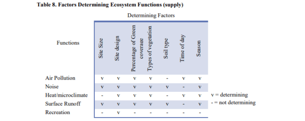 Las funciones de los ecosistemas se refieren a las propiedades / procesos biológicos o del sistema de los ecosistemas. Las funciones de los ecosistemas se convierten en servicios de los ecosistemas solo cuando benefician a la población humana (Constanza et al., 1997; Serna-Chaveza, 2014). En otras palabras, las funciones del ecosistema se convierten en servicios del ecosistema cuando en realidad son utilizadas por la población humana. Esto implica una fuerte relación entre la demanda y la oferta de servicios ecosistémicos. Se han propuesto numerosas estrategias de adaptación urbana para aumentar las unidades de provisión de servicios ecosistémicos (Service Providing Unite / SPU) para responder a la creciente demanda en áreas urbanas (Givoni, 1991; Gill et al., 2007; Bowler, 2010), como el “movimiento de la ciudad verde”.
