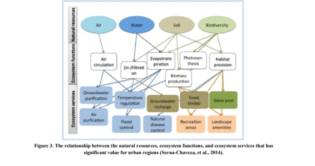 Figura 3. La relación entre los recursos naturales, las funciones del ecosistema y los servicios del ecosistema que tiene un valor significativo para las regiones urbanas (Serna-Chaveza, et al., 2014).
