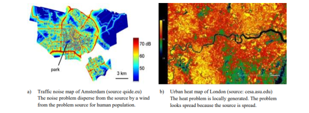 Los tipos de fuentes que producen problemas urbanos y la relación espacial entre los problemas urbanos, la población humana y el parque también influyen en la prestación de servicios ecosistémicos. Cuando los problemas se dispersan desde la fuente a través del espacio (por ejemplo, la contaminación del aire, la perturbación del ruido y la escorrentía superficial) y un parque puede (parcialmente) interceptar el problema antes de que llegue a las personas, los espacios verdes pueden ubicarse entre la fuente de la dispersión y la dispersión.