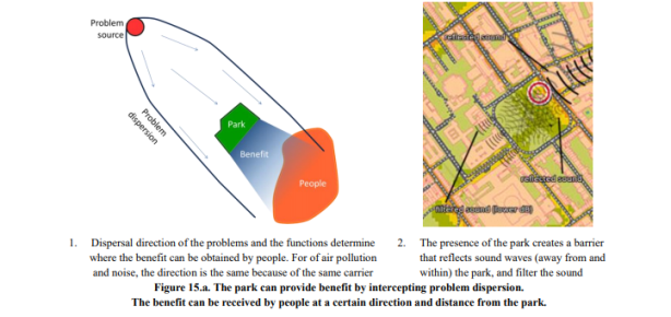 Beneficiarse de servicios como el mejoramiento del microclima, la absorción de contaminantes y la población humana que se encuentra a cierta distancia de un espacio verde puede recibir una reducción del nivel de ruido. Esto se debe a la capacidad de las funciones para dispersarse de la fuente a la población humana por un portador a través de una ruta de flujo. El operador de las funciones tiene una gran influencia en la trayectoria del flujo, las formas urbanas que rodean el parque y la condición meteorológica local.
