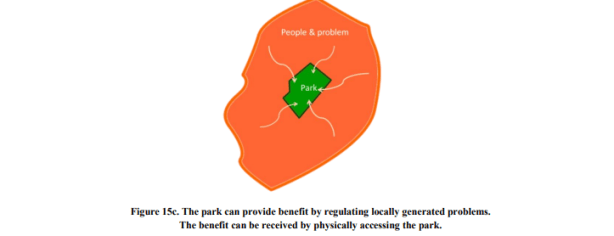 Los parques tienen una correlación positiva con la calidad del entorno de vida y la salud al proporcionar servicios de los ecosistemas. Sin embargo, el desarrollo de nuevos parques a menudo descuida el requisito necesario para que los parques puedan proporcionar y brindar servicios de ecosistemas a la población.