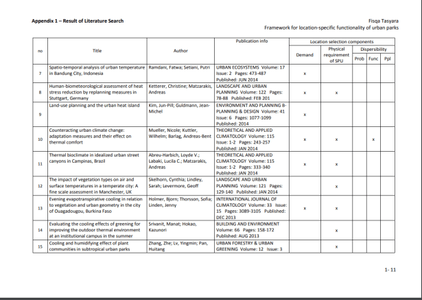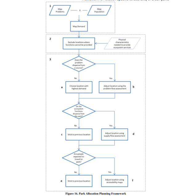 Para los problemas que no pueden dispersarse de sus fuentes, como el calor urbano, entonces el parque debe estar ubicado cerca del beneficiario. La asignación del parque no solo debe estar determinada por la disponibilidad de terrenos, sino también en función de la demanda y los posibles servicios que puede proporcionar el parque. El marco propuesto en esta investigación toma los requisitos espaciales del parque junto con sus requisitos de características físicas para garantizar la prestación de servicios ecosistémicos a sus beneficiarios.