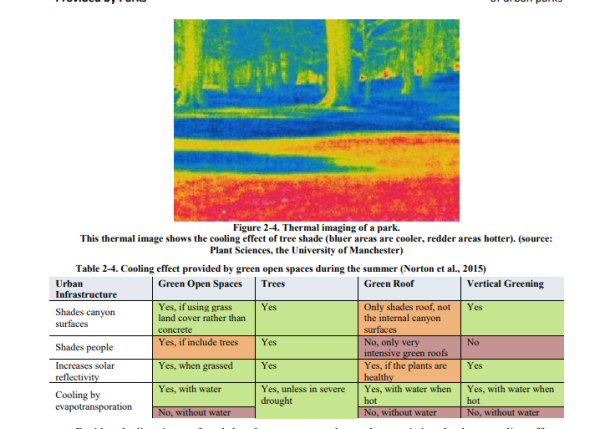 La vegetación también puede regular la temperatura local de la superficie y del aire al reflejar la radiación solar y las superficies de sombra, como calles y aceras que de otra manera absorberían el calor (Gómez-Baggethun, et al., 2013). Se ha informado que un árbol grande puede gastar 9.6E + 05 kJ (230,000 kcal) de energía por día, equivalente a cinco acondicionadores de aire que trabajan 19 h por día (Federer, 1971). La característica del agua en los parques también amortigua las temperaturas extremas al absorber el calor a alta temperatura y liberarlo cuando esta frio. Este proceso ocurre en períodos cortos de noche y día, o períodos más largos en verano e invierno. La reducción de la temperatura no ocurre solo en los parques o en las áreas sombreadas. Este efecto se puede detectar hasta aproximadamente un ancho del parque que se aleja del parque (Jauregui, 1990 en (Yu & Hien, 2006). Las diferentes temperaturas entre áreas crean el movimiento de aire desde áreas con temperaturas más altas a más bajas. Este fenómeno estabiliza gradualmente la temperatura en áreas urbanas a un nivel más cómodo.