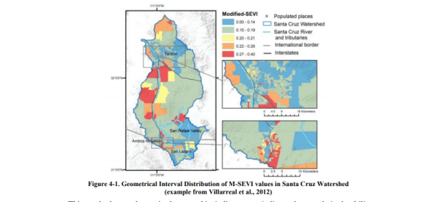 - (iii) una dimensión de Activos del hogar, que proporciona una medida indirecta de los ingresos del hogar a través del uso de la cantidad de riqueza controlada por las familias en cada ciudad (Villarreal, et al., 2012). Cuando se aplica a las unidades censales cartografiadas, la distribución de las poblaciones vulnerables se puede mapear y visualizar a través de las fronteras internacionales y se puede comparar con los servicios ecosistémicos cartografiados para comprender mejor la equidad ambiental del área de estudio.