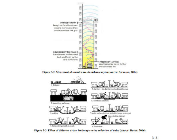 El tráfico, la construcción y otras actividades humanas que crean sonidos no deseados (ruido) en las ciudades aumentan el nivel de estrés de los habitantes urbanos y, al final, reducen la calidad de vida. La investigación ha encontrado que la exposición crónica al ruido resultará en una disminución de la calidad del sueño y en los niveles de concentración (Moudon, 2009), incrementará los niveles generales de estrés de los individuos (Radford y James, 2013) y tendrá efectos fisiopatológicos adversos que contribuyen a la progresión de la hipertensión u otros. Condiciones cardiovasculares (Willich, et al., 2006). La perturbación del ruido es fundamentalmente una cuestión de percepción pública, sin embargo, la perturbación continua del ruido causará trastornos de salud física además de la molestia mental. Por ejemplo, el ruido ambiental (el ruido que abarca todo lo relacionado con cualquier entorno dado) estándar para el asentamiento en Indonesia es 55dB (A) (Ministerio de Medio Ambiente, 1996) que es el nivel de ruido estándar para oficinas comerciales con conversación normal (Zannin, et al. al., 2006). Por otro lado, según Doelle (1972), el nivel de confort preferido es cuando el nivel de ruido no supera los 30 dB en los asentamientos urbanos. El sonido intermitente y continuo de 30-70dB causará la interrupción de la membrana auditiva y el nerviosismo, 65-90 dB causará alteraciones en el tejido celular de los órganos humanos (corazón, venas de la sangre, etc.) (Setiawan, 2010) y un ruido continuo por encima de 85dB resultará en un problema de audición temporal a la pérdida de audición permanente (Doelle, 1972