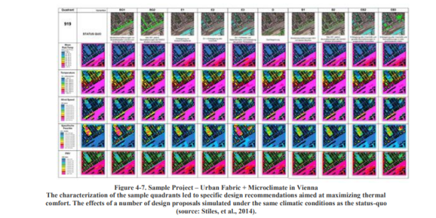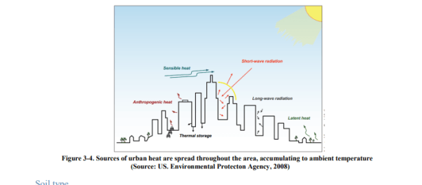 La temperatura más alta registrada en una ciudad comúnmente tiene lugar en un distrito con una estructura de construcción densa, un alto grado de sellado de la superficie con poca vegetación y / o agua y liberación de calor antropogénico (Merbitz, et al., 2011; Ramdani y Setiani, 2014 ; Nortona, et al., 2015). La cobertura verde baja conduce a una menor evapotranspiración, y la transpiración que puede mantener frías las zonas urbanas. Los materiales seleccionados para la superficie del edificio son generalmente aquellos con baja emisividad que reflejarán el rayo solar.