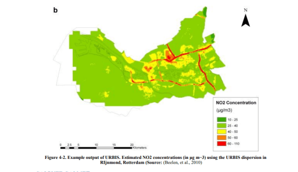 Sistema de información urbana (URBIS) URBIS es un modelo de dispersión desarrollado para identificar la calidad del aire, la perturbación del ruido y los riesgos de seguridad externa. Este sistema integra datos existentes, modelos, procedimientos de cálculo estándar y un Sistema de Información Geográfica (SIG) en un sistema local de modelo de contaminación del aire y ruido. Los datos de entrada son datos de emisiones del tráfico como fuentes de línea, grandes fuentes puntuales industriales, envíos como fuentes puntuales en las vías navegables, y otros como hogares y pequeñas industrias definidas como emisiones por kilómetro cuadrado (Beelen, 2010).