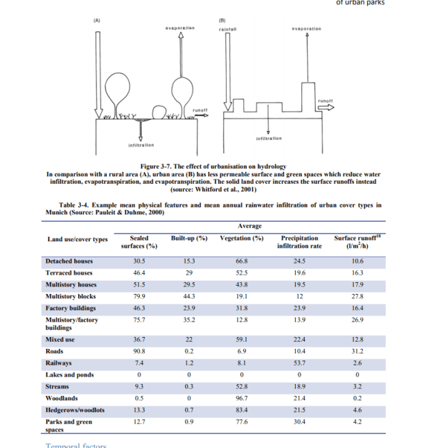 Los usos de la tierra circundantes determinan la capacidad de atenuación de la escorrentía superficial del parque. Los diferentes materiales de cobertura del suelo tienen diferentes tasas de infiltración, lo que hace que los diferentes usos de la tierra que tienen diferentes coberturas dominantes tengan una tasa de escorrentía superficial diferente a la encontrada por Pauleit y Duhme (2000). Los usos de la tierra (por ejemplo, el distrito central de negocios o el área industrial) con alta densidad de construcción y población, y baja cobertura verde comúnmente tienen un gran volumen de escorrentía superficial porque hay menos vegetación (las hojas y los tallos) para interceptar la lluvia, y una gran área de las superficies impermeables (por ejemplo, cemento, asfalto o tierra compactada) que dominan el área evitan el proceso de infiltración de agua en el suelo. El aumento de la superficie impermeable causa una infiltración deficiente y una reducción de la resistencia al flujo (debido a tiempos de concentración más rápidos). La escorrentía de la escorrentía de las áreas limítrofes conduce a un aumento de la entrada de agua que podría acelerar la capacidad de retención máxima del suelo. Cuando se alcanza, el volumen de agua total que cae o fluye hacia el área se convertirá en escorrentía superficial hacia el suelo inferior.