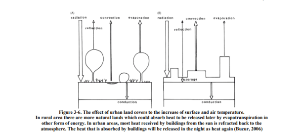 La temperatura más alta registrada en una ciudad comúnmente tiene lugar en un distrito con una estructura de construcción densa, un alto grado de sellado de la superficie con poca vegetación y / o agua y liberación de calor antropogénico (Merbitz, et al., 2011; Ramdani y Setiani, 2014 ; Nortona, et al., 2015). La cobertura verde baja conduce a una menor evapotranspiración, y la transpiración que puede mantener frías las zonas urbanas. Los materiales seleccionados para la superficie del edificio son generalmente aquellos con baja emisividad que reflejarán el rayo solar.