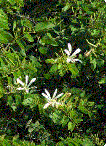 En las zonas periféricas hay un bosque mediterráneo, compuesto de árboles de diversos tipos y alturas: desde el eucalipto con sus flores rojas (Eucalyptus sideroxylon), hasta las perfumadas Sophoreae (Sophora secundiflora) y el australiano Sweet Pittosporum (Pittosporum undulatum). En el parterre hay un ejemplar poco común de la flor del ave del paraíso, a medio camino entre la Strelitzia reginae y la S. juncea.