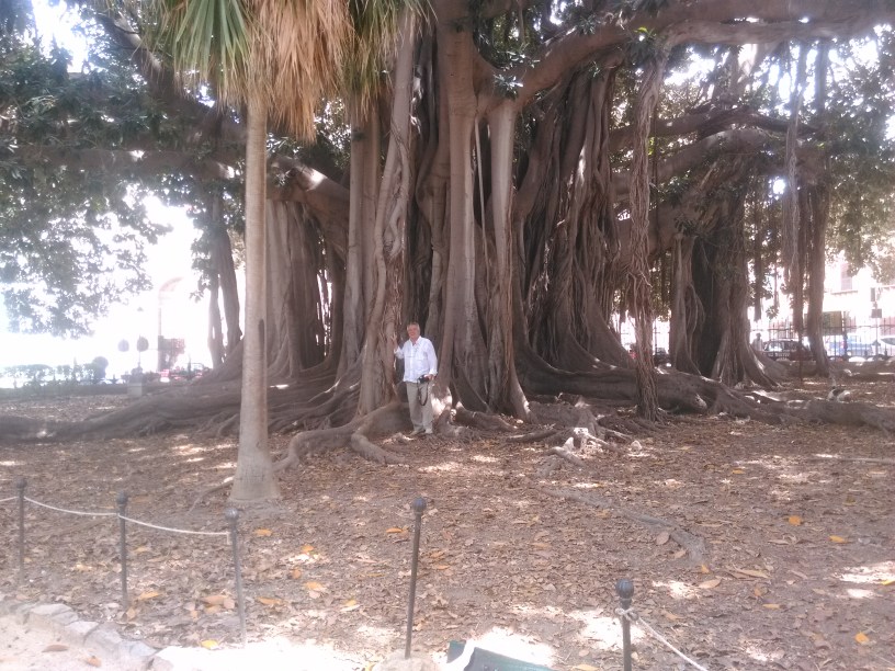 El Ficus del Giardino Garibaldi, con una extensión de más de cincuenta metros y treinta metros de altura, según la Accademia dei Georgofili, es el árbol más grande de Europa. Introducida por los Jardines Botánicos alrededor de 1845 como Ficus nervosa, en 1897 fue rebautizada como F. magnolioides por su evidente similitud en forma, consistencia y color de sus hojas, a la Magnolia grandiflora, un árbol estadounidense plantado con frecuencia en los jardines del norte. Este nuevo nombre crea una confusión todavía en curso, que cancela la identidad de una especie, que tiene muchas razones para tener una propia, incluso más allá de los límites de la ciencia de las plantas. Finalmente, los botánicos Fici y Raimondo hicieron la claridad, quienes en 1996 declararon que era una especie bien conocida y que no había esperado a Palermo para ser reconocida y descrita: Ficus macrophylla subsp. columnar es para indicar la extraordinaria forma en que crece, sacando raíces aéreas que luego se lanzan al suelo y refuerzan, como columnas, su dosel. El árbol, gracias a esto, crece más en anchura que en altura y «es imposible saber de dónde viene y a dónde va», dijo un botánico australiano. En 2001, una nueva revisión taxonómica y nomenclatural considera a este taxón como un tipo en lugar de una subespecie. Hoy, por lo tanto, el nombre internacional reconocido es Ficus macrophylla f. columnaris. Su particularidad y singularidad botánica han asegurado a los ficus un lugar en la literatura europea: es en uno de estos que Robinson Crusoe construye su primera casa en un árbol; Las formas de fantasía de las ‘casas del árbol’ en el Bosque de Pandora en la película Avatar se basan en este árbol y Emilio Salgari en ‘El Misterio de la Selva Negra’ señala cómo un solo árbol «forma un bosque, apoyado por cientos y cientos de Columnas extrañas, bajo las cuales los sacerdotes brahmanes colocan sus ídolos ”.