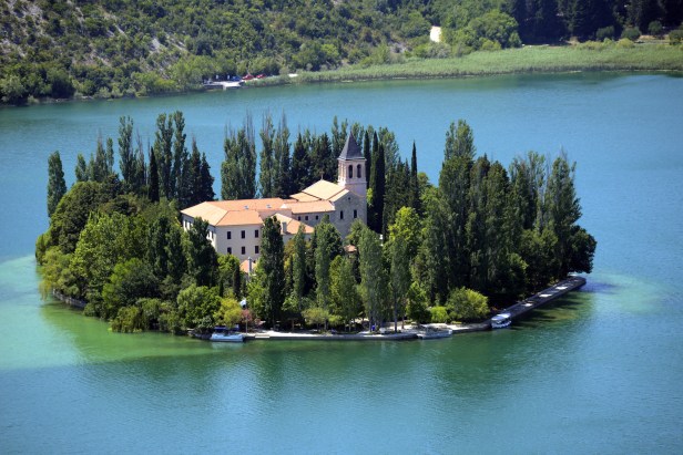 Ubicado en una isla de Krka, en un entorno verde, este monasterio franciscano aparece como la joya del parque. En todos los lados, los turistas y peregrinos pueden llegar allí en barco, pero el cruce más corto comienza desde Brištane. La parte antigua (iglesia, claustro y común) fue erigida en el siglo XV. Durante las invasiones otomanas, en el siglo XVII, los edificios fueron incendiados y los monjes tuvieron que abandonar el lugar. No fue hasta el siglo XVIII que el lugar fue reconstruido según los planos del arquitecto Tomi Babić, con la adición del ala de Babuš y, más tarde, el pozo y el pórtico. Es de un conjunto arquitectónico renacentista y barroco de gran elegancia. El monasterio alberga una colección arqueológica, un museo de arte sacro, una biblioteca histórica y un huerto.