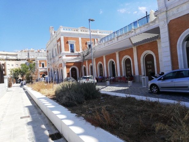 Además de la rehabilitación de la estación como mercado se incluyó un aparcamiento subterráneo -bajo la plaza pública- con 105 plazas y se habilitó la plaza al final de la Avenida de Cádiz, frente a la antigua Estacion con escasa sombra, con poca vegetación y estanques de agua.