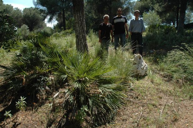 Junto a estos se encuentran algunas especies autóctonas, como encinas y acebuches silvestres, además de matorral propio del bosque mediterráneo como lentisco, palmito, madroño y diversas jaras.