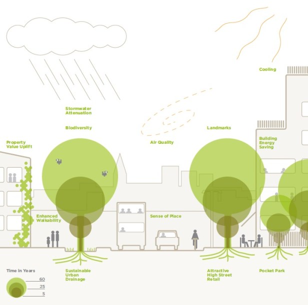 - Recoja toda la gama de beneficios que los árboles pueden brindar como parte de un sistema de infraestructura verde local, centrándose en las aspiraciones locales clave.