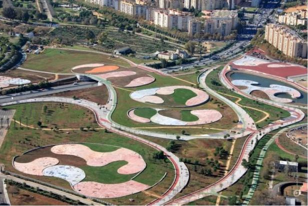 En parque configurado por suaves lomas, amplios paseos, extensas explanadas,  con un canal y un par de lagunas y espacios libres para desarrollar otras actividades.